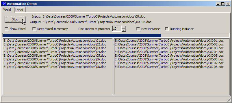 During the first part of the session I showed how automation works by "controlling" Microsoft Word from an application. The demo simply opens up a Word document and saves it under a different name. The code is pretty self-explanatory. I never got the Excel example to run correctly, so there's nothing on that page.