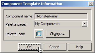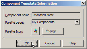 In order to make the new TMonsterFrame easily available for other applications, you should add it to the component palette. This is done similarly to how you added a component template. For frames, right click on the frame and choose "Add To Palette". You will be prompted for a name and a component page where to put it.