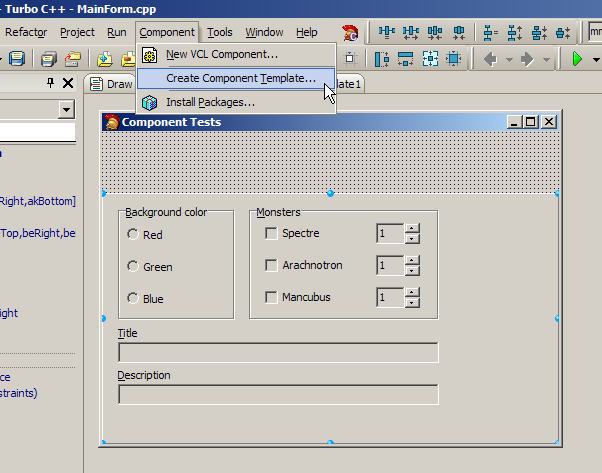Once you've created the component template, create a new application ("File | New | VCL Forms Application - C++ Builder"), and drop the TMonsterPanel on the form. Press F9 to compile, link, and run, and you'll see all of the functionality from the component template works in the application. (Again, it doesn't get much easier than this.)