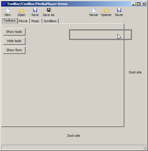 Dockable Toolbars (There's a flash video that shows the docking in action.)During the first part of the session, I showed how you can undock a toolbar and create a floating toolbar. You can dock/undock on other forms in the application. This was done using a simple TToolBar object. I also showed how to put toolbars on a TCoolBar component which allowed you to rearrange the toolbars without necessarily undocking them. For more information, see Chapter 6 Working with controls in the Developer's Guide.
