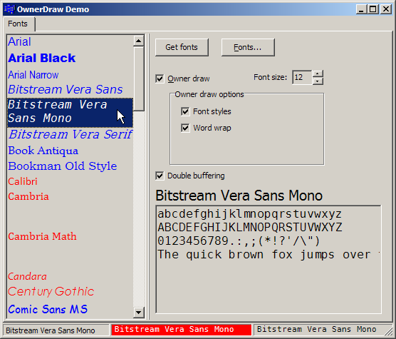 This application shows how to use the OwnerDraw style to display each line in a list box in a different font and/or color. It also shows how to draw each panel in the status bar in a different way. There isn't a lot of code or a lot of output displayed here, but the OwnerDraw technique is a very powerful concept that can come in handy when you need it.