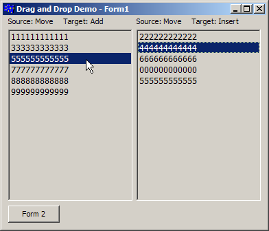 This project demonstrates how to drag and drop between different windows (forms) of an application. In addition to the drag and drop stuff, I showed how to use the Anchor property of a component to properly resize a form.