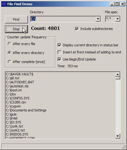 During the third part of the session, I showed another way of traversing subdirectories in the Windows file system. This time, I made a multi-threaded application that allowed the application to search in multiple folders simultaneously. There is a lot of good information in this simple application. For details on working with the TThread class, look at Chapter 11 Writing multi-threaded applications in the Developer's Guide.